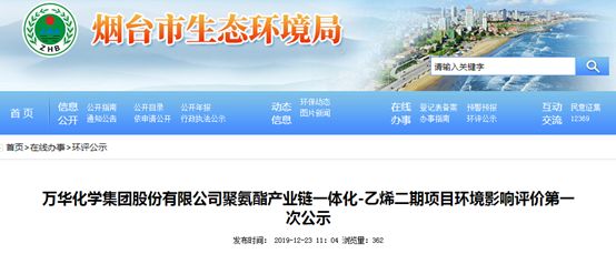 上月底,“萬華化學(xué)集團股份有限公司聚氨酯產(chǎn)業(yè)鏈一體化—乙烯二期項目”環(huán)境影響評價在網(wǎng)上公示。