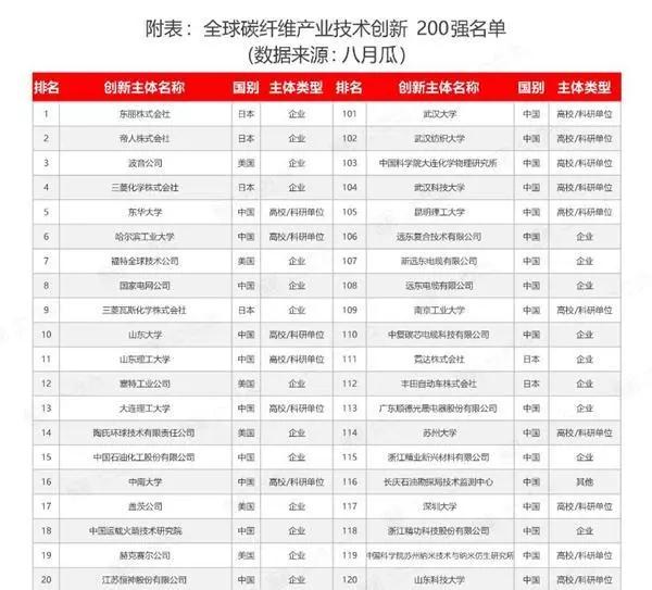 ????????據(jù)報(bào)告評(píng)測(cè)結(jié)果,全球碳纖維產(chǎn)業(yè)技術(shù)創(chuàng)新200強(qiáng)中,麗株式會(huì)社居于首位,第2名為帝人株式會(huì)社,第3名為波音公司,第4至10名依次為三菱化學(xué)株式會(huì)社、東華大學(xué)、哈爾濱工業(yè)大學(xué)、福特全球技術(shù)公司、國(guó)家電網(wǎng)公司、三菱瓦斯化學(xué)株式會(huì)社和山東大學(xué)。