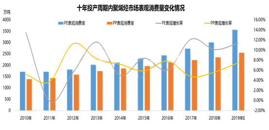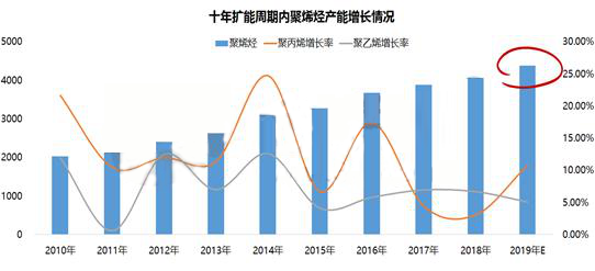 ????????隨著新型城鎮(zhèn)化、新型工業(yè)化、農(nóng)業(yè)現(xiàn)代化和國(guó)際貿(mào)易發(fā)展等對(duì)聚烯烴需求的總體支撐,以及國(guó)民高質(zhì)量生活、教育、醫(yī)療、養(yǎng)老等服務(wù)性需求提升,聚烯烴在新材料、汽車(chē)輕量化、綠色建材、醫(yī)療器械、食品級(jí)包裝、電子電器小型化等方面的應(yīng)用日益廣泛。生育政策放開(kāi)、人口老齡化、醫(yī)療需求增加等都刺激高品質(zhì)聚烯烴樹(shù)脂需求增長(zhǎng),因此近幾年國(guó)內(nèi)聚烯烴產(chǎn)能經(jīng)歷了快速到高速的增長(zhǎng)。PE非耐消費(fèi)品占比在73%,PP在66%,一次性快消品的需求特征決定其需求相對(duì)穩(wěn)定。