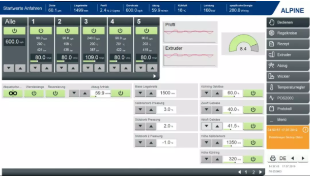 ????????除了擠出控制之外,Syncro還為希望實(shí)現(xiàn)整個(gè)生產(chǎn)線的單點(diǎn)控制的吹膜制造商開發(fā)了Syntrol? 監(jiān)控系統(tǒng),該系統(tǒng)可以通過(guò)一個(gè)觸摸屏顯示和同步多個(gè)生產(chǎn)線控制。這些控制包括對(duì)擠出機(jī)的溫度和壓力、空氣環(huán)、IBC、厚度計(jì)、籠和牽引的控制。