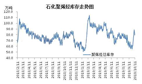 ????????為準(zhǔn)備國慶長假,節(jié)前下游一度出現(xiàn)補(bǔ)倉,帶動(dòng)9月底庫存降至最低時(shí)為55.5萬噸,雖最后庫存稍有增加,但整體情況尚可。隨著國慶長假到來,市場基本處于休市狀態(tài),導(dǎo)致假期石化庫存大幅積累,增加28萬噸。即便節(jié)后下游補(bǔ)貨,但高庫存導(dǎo)致心態(tài)謹(jǐn)慎,多為剛需采購,庫存消耗緩慢并不理想。截止10月11日,石化兩桶油庫存為79.5萬噸。