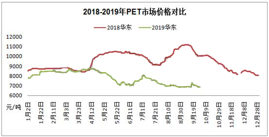 ????????PET: 本月,國內(nèi)瓶級PET市場整體呈先揚后抑走勢。上半月,瓶級PET市場持續(xù)處于低位震蕩格局,華東市場價格圍繞在6700-6950元/噸的區(qū)間徘徊。原料PTA市場窄幅波動,成本支撐穩(wěn)固,瓶片廠家多維持前期訂單發(fā)貨,現(xiàn)貨資源有限,廠家挺價出貨為主。下游前期備貨充足,需求持續(xù)較淡,買盤謹(jǐn)慎觀望為主,市場成交量有限。16-17日,國際原油高漲刺激下,聚酯原料PTA和乙二醇市場沖高,成本面利好推動,瓶片廠家報盤紛紛積極跟漲,華東市場價格漲至7150-7400元/噸。18日開始,隨著國際原油價格回落,原料PTA和乙二醇市場開始走低,成本面利空打壓下,瓶片廠家報盤紛紛下調(diào),中間經(jīng)銷商積極降價促銷,市場價格加速回落。至月底,華東市場重心跌至6750-6900元/噸。因?qū)笫行判牟蛔?,下游買盤積極性較低,僅維持剛需備貨為主,疲弱需求持續(xù)拖累市場。截止29日,9月華東地區(qū)瓶級PET市場均價在6911元/噸,環(huán)比漲0.01%,同比跌34.89%,最高價出現(xiàn)在9月17日的7400元/噸,最低價出現(xiàn)在4日的6700元/噸。