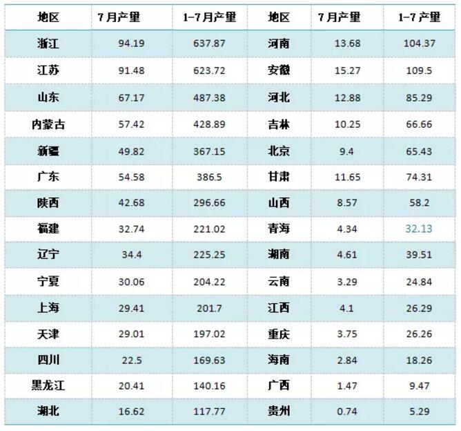 ????????1-7月初級形態(tài)塑料產(chǎn)量排名前五位(浙江、江蘇、山東、內(nèi)蒙古和廣東)的總產(chǎn)量達(dá)到2564.36萬噸,占到全國總產(chǎn)量47%。(按7月規(guī)模企業(yè)統(tǒng)計(jì))