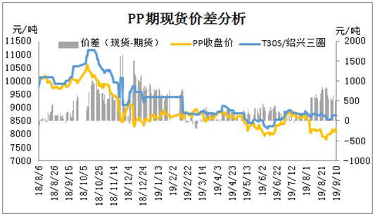 ????????由PP期現(xiàn)貨價(jià)差對(duì)比發(fā)現(xiàn),期現(xiàn)貨價(jià)差在七八月份價(jià)差明顯擴(kuò)大化,進(jìn)入九月份期貨受資金面及供需面支撐,期貨連漲助推期現(xiàn)貨價(jià)差逐步收窄。商家受長期利潤虧損影響,面對(duì)期貨連漲局勢(shì),炒作心態(tài)油然而生。目前因國內(nèi)PP產(chǎn)能集中檢修,市場(chǎng)供應(yīng)面利好支撐市場(chǎng)報(bào)盤。期現(xiàn)貨價(jià)差受供需影響有進(jìn)一步收窄趨勢(shì)。