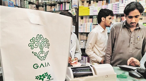 ????????巴基斯坦政府日前頒布“禁塑令”,首都伊斯蘭堡全面禁止使用一次性不可降解塑料袋,違反者將受到嚴(yán)厲處罰。旁遮普省、信德省等地也將很快實施類似法規(guī)。圖為藥店提供的收費環(huán)保袋。