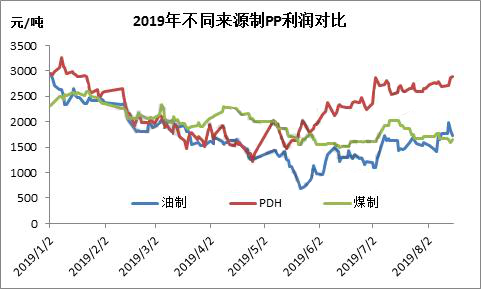 ????????此次東華能源計(jì)劃投產(chǎn)的裝置,繼續(xù)采用PDH工藝,為何近幾年來PDH裝置如雨后春筍般,蜂擁而至?首先從終端產(chǎn)品利潤(rùn)來看。以聚丙烯為例,2019年丙烷脫氫制聚丙烯平均利潤(rùn)在2000元/噸以上,下半年以來,因?yàn)楸閮r(jià)格震蕩下行,跌幅遠(yuǎn)大于聚丙烯價(jià)格跌幅,生產(chǎn)企業(yè)利潤(rùn)好轉(zhuǎn)。丙烷脫氫制聚丙烯利潤(rùn)明顯好于煤制和油制利潤(rùn)。