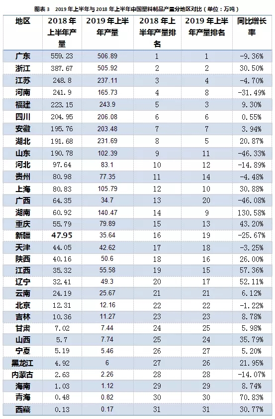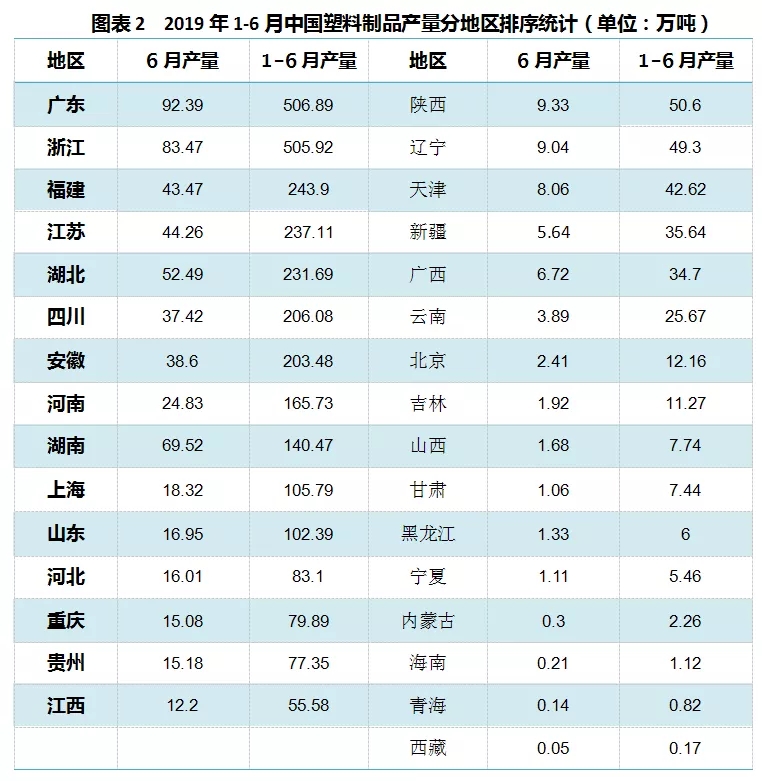 ????????1-6月塑料制品累計(jì)產(chǎn)量排名前五位(廣東、浙江、福建、江蘇和湖北)的總產(chǎn)量達(dá)到1725.51萬噸,占到全國(guó)總產(chǎn)量53.3%。(按6月規(guī)模企業(yè)統(tǒng)計(jì))