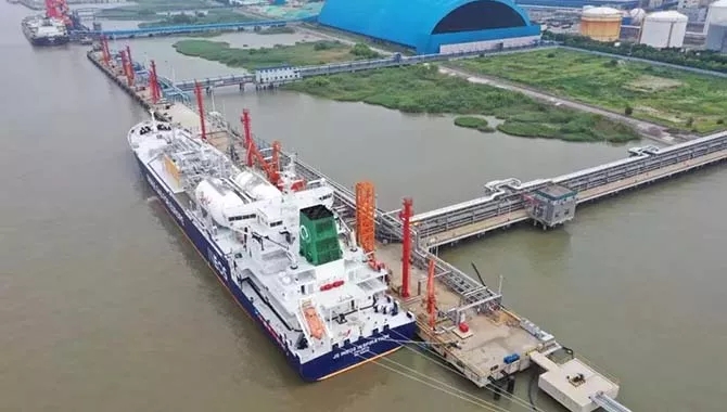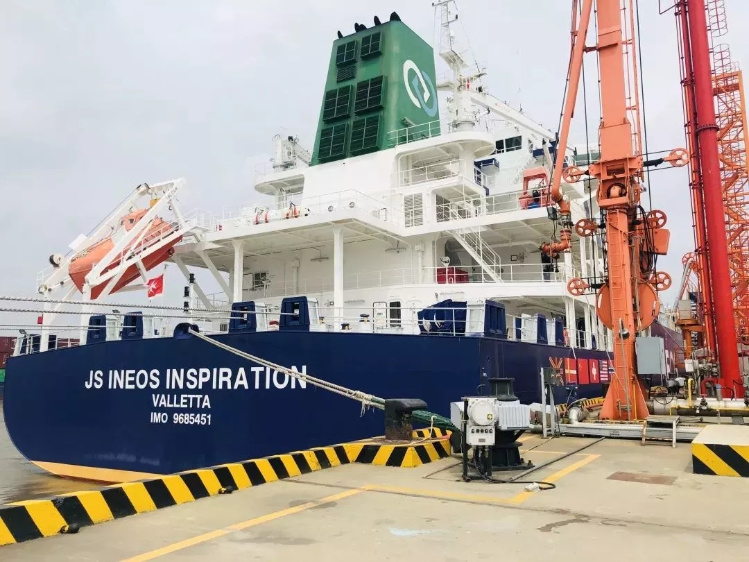 ????????8月7日13時(shí),乙烷運(yùn)輸船“英力士靈感號(hào)”靠泊泰興新浦2號(hào)碼頭。船上搭載的 1.5萬(wàn)噸進(jìn)口乙烷在經(jīng)過(guò)南京海關(guān)所屬泰州海關(guān)的現(xiàn)場(chǎng)查驗(yàn)后,順利開(kāi)卸,這也是國(guó)內(nèi)企業(yè)首次進(jìn)口乙烷產(chǎn)品。