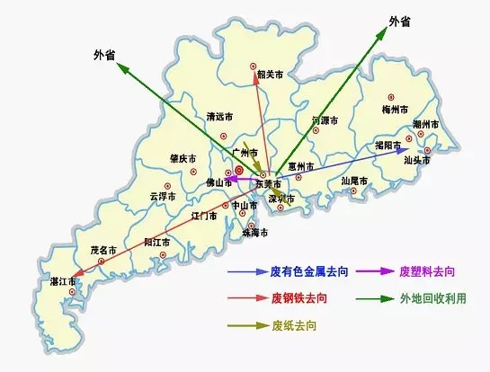 ????????目前,東莞市廢紙主要在本地造紙廠回收利用;廢塑料主要流向佛山等珠三角地區(qū)的塑料造粒加工企業(yè);廢鋼鐵主要運往韶關、湛江、省外城市等地區(qū)進行冶煉;廢有色金屬、廢電子主要流向粵東進行回爐再用。