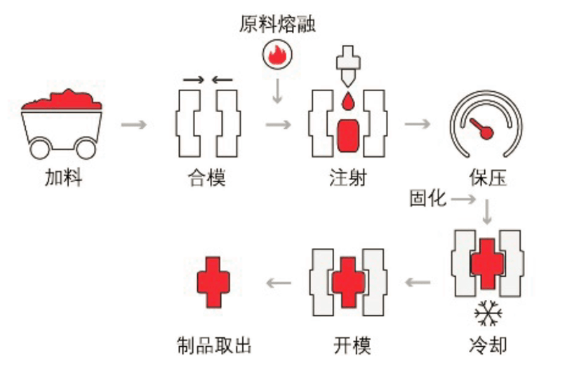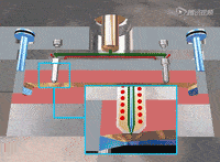 3.在柱塞或螺桿的加壓下物料被壓縮并向前移動,通過機(jī)筒前的射嘴以很快的速度注入較低溫度的閉合模腔內(nèi);