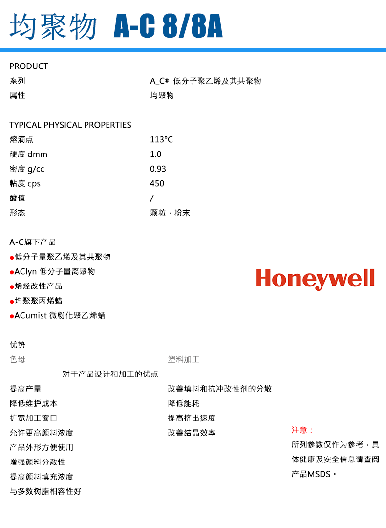 • Honeywell霍尼韋爾 A-C 8A 蠟粉 物性表, Honeywell霍尼韋爾 A-C 8A 蠟粉 產(chǎn)品參數(shù),Honeywell霍尼韋爾 A-C 8A 蠟粉 性能表,Honeywell霍尼韋爾 A-C 8A 蠟粉 出廠(chǎng)報(bào)告, MSDS,, 物質(zhì)安全資料表, UL黃卡,{ SGS報(bào)告, RoHS, 食品級(jí)認(rèn)證, NSF飲用水標(biāo)準(zhǔn), 產(chǎn)品資料, 產(chǎn)品性能, 出廠(chǎng)報(bào)告, 原廠(chǎng)原包, 代理商, 熱變形溫度, 熔指數(shù), 流動(dòng)系數(shù), 抗沖擊性能、沖擊強(qiáng)度, 低溫韌性、低溫抗沖擊性能, 熔體流動(dòng)系數(shù)、熔體流動(dòng)速率, 加工工藝、加工參數(shù)、加工溫度, 歐盟RoHS 德國(guó)FDA 美國(guó)FDA 日本FDA