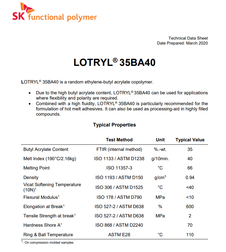 - 阿科瑪增韌劑相容劑EBA Lotryl 35BA40 物性表, 阿科瑪增韌劑相容劑EBA Lotryl 35BA40 產(chǎn)品參數(shù),阿科瑪增韌劑相容劑EBA Lotryl 35BA40 性能表,阿科瑪增韌劑相容劑EBA Lotryl 35BA40 出廠報告, MSDS,, 物質(zhì)安全資料表, UL黃卡,{ SGS報告, RoHS, 食品級認證, NSF飲用水標準, 產(chǎn)品資料, 產(chǎn)品性能, 出廠報告, 原廠原包, 代理商, 熱變形溫度, 熔指數(shù), 流動系數(shù), 抗沖擊性能、沖擊強度, 低溫韌性、低溫抗沖擊性能, 熔體流動系數(shù)、熔體流動速率, 加工工藝、加工參數(shù)、加工溫度, 歐盟RoHS 德國FDA 美國FDA 日本FDA