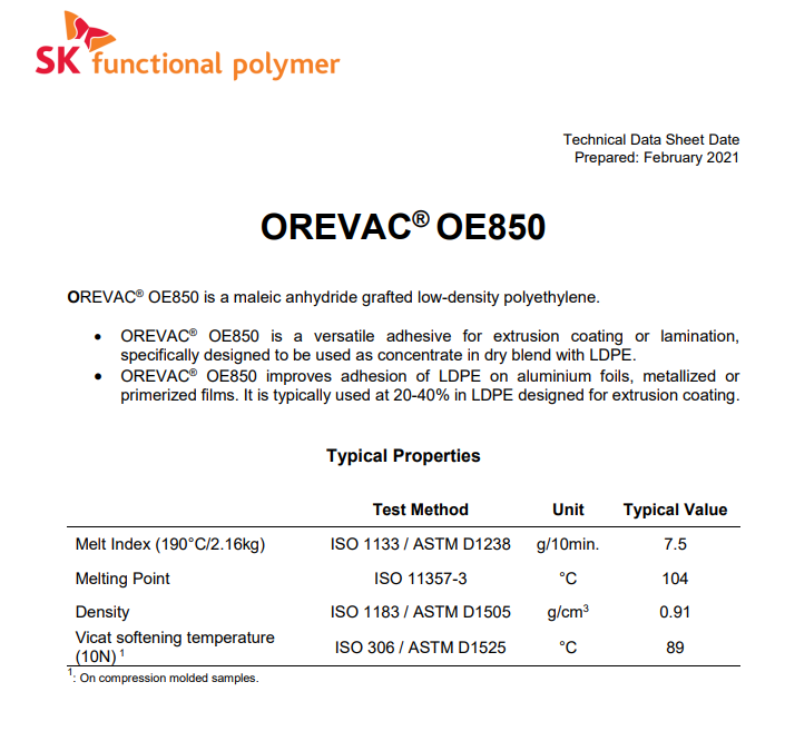 - 阿科瑪Orevac® OE850粘結(jié)樹脂粘結(jié)樹脂 物性表, 阿科瑪Orevac® OE850粘結(jié)樹脂粘結(jié)樹脂 產(chǎn)品參數(shù),阿科瑪Orevac® OE850粘結(jié)樹脂粘結(jié)樹脂 性能表,阿科瑪Orevac® OE850粘結(jié)樹脂粘結(jié)樹脂 出廠報(bào)告, MSDS,, 物質(zhì)安全資料表, UL黃卡,{ SGS報(bào)告, RoHS, 食品級(jí)認(rèn)證, NSF飲用水標(biāo)準(zhǔn), 產(chǎn)品資料, 產(chǎn)品性能, 出廠報(bào)告, 原廠原包, 代理商, 熱變形溫度, 熔指數(shù), 流動(dòng)系數(shù), 抗沖擊性能、沖擊強(qiáng)度, 低溫韌性、低溫抗沖擊性能, 熔體流動(dòng)系數(shù)、熔體流動(dòng)速率, 加工工藝、加工參數(shù)、加工溫度, 歐盟RoHS 德國FDA 美國FDA 日本FDA