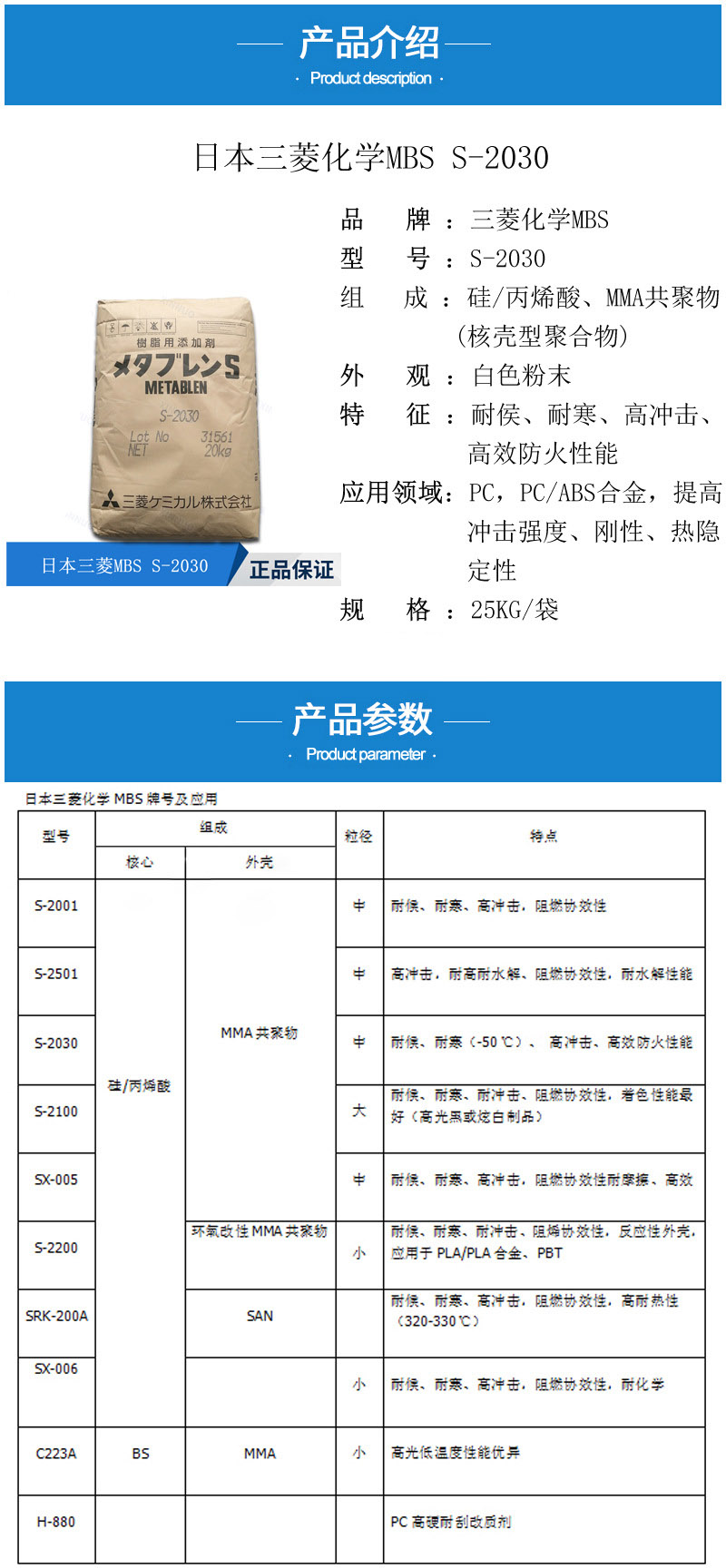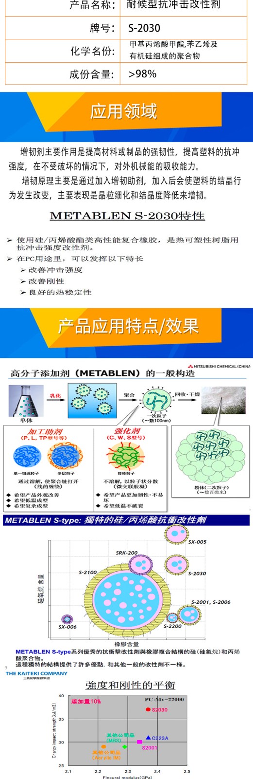 • 三菱增韌劑S2030 耐候耐寒(-50℃)增韌 高效防火 麗陽MBS S-2030 物性表, 三菱增韌劑S2030 耐候耐寒(-50℃)增韌 高效防火 麗陽MBS S-2030 產(chǎn)品參數(shù),三菱增韌劑S2030 耐候耐寒(-50℃)增韌 高效防火 麗陽MBS S-2030 性能表,三菱增韌劑S2030 耐候耐寒(-50℃)增韌 高效防火 麗陽MBS S-2030 出廠報告, MSDS,, 物質(zhì)安全資料表, UL黃卡,{ SGS報告, RoHS, 食品級認(rèn)證, NSF飲用水標(biāo)準(zhǔn), 產(chǎn)品資料, 產(chǎn)品性能, 出廠報告, 原廠原包, 代理商, 熱變形溫度, 熔指數(shù), 流動系數(shù), 抗沖擊性能、沖擊強(qiáng)度, 低溫韌性、低溫抗沖擊性能, 熔體流動系數(shù)、熔體流動速率, 加工工藝、加工參數(shù)、加工溫度, 歐盟RoHS 德國FDA 美國FDA 日本FDA