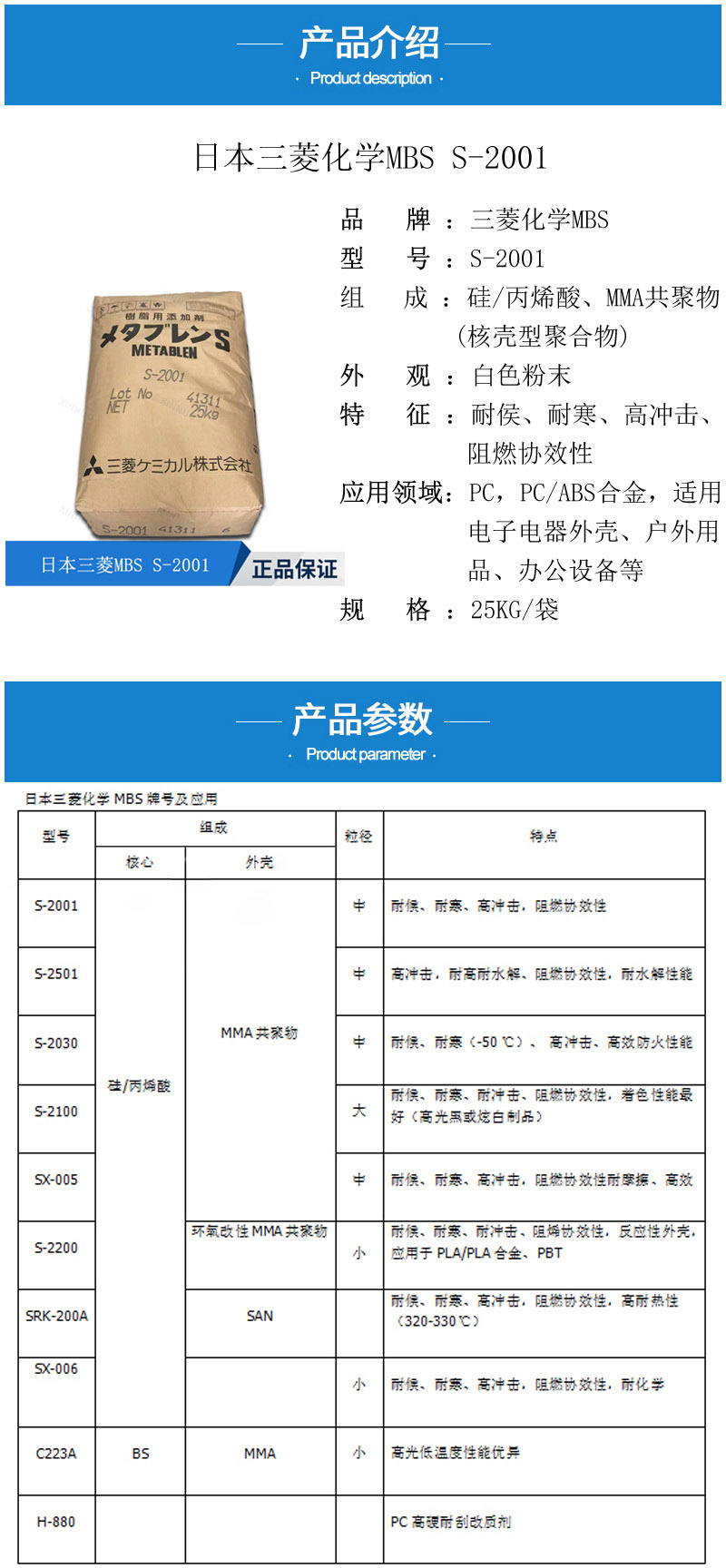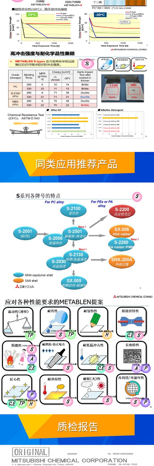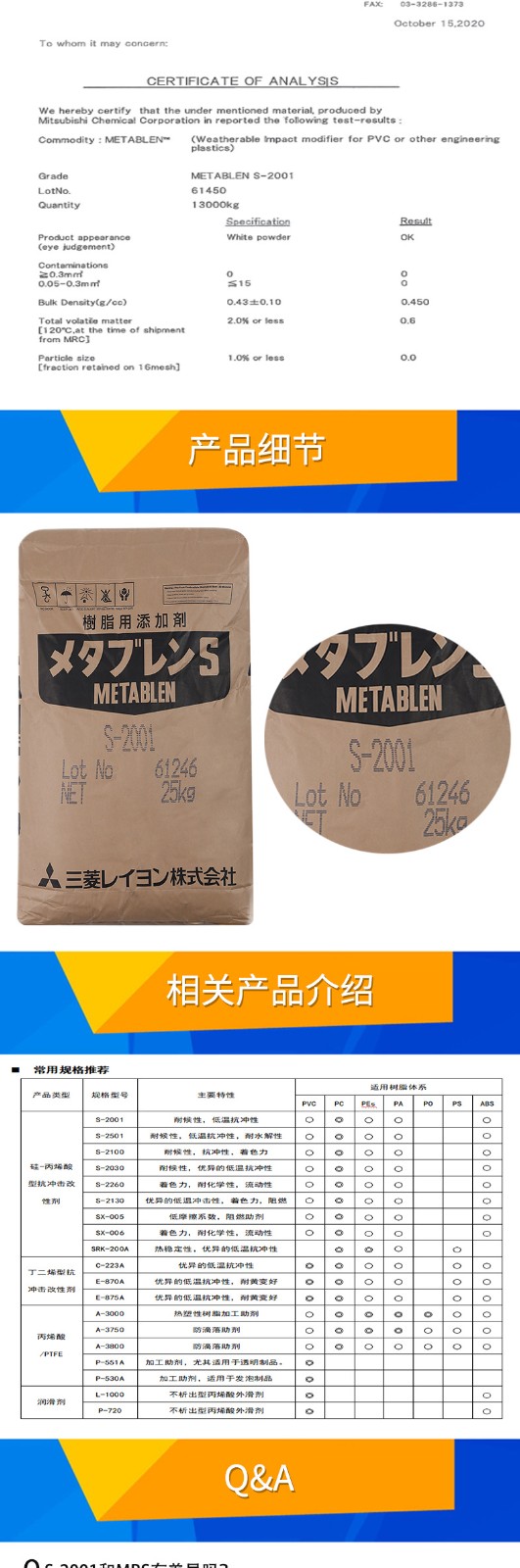 • 日本三菱S2001增韌劑 塑料改性 PC增韌耐候耐寒 麗陽MBS S-2001 物性表, 日本三菱S2001增韌劑 塑料改性 PC增韌耐候耐寒 麗陽MBS S-2001 產(chǎn)品參數(shù),日本三菱S2001增韌劑 塑料改性 PC增韌耐候耐寒 麗陽MBS S-2001 性能表,日本三菱S2001增韌劑 塑料改性 PC增韌耐候耐寒 麗陽MBS S-2001 出廠報告, MSDS,, 物質(zhì)安全資料表, UL黃卡,{ SGS報告, RoHS, 食品級認(rèn)證, NSF飲用水標(biāo)準(zhǔn), 產(chǎn)品資料, 產(chǎn)品性能, 出廠報告, 原廠原包, 代理商, 熱變形溫度, 熔指數(shù), 流動系數(shù), 抗沖擊性能、沖擊強(qiáng)度, 低溫韌性、低溫抗沖擊性能, 熔體流動系數(shù)、熔體流動速率, 加工工藝、加工參數(shù)、加工溫度, 歐盟RoHS 德國FDA 美國FDA 日本FDA