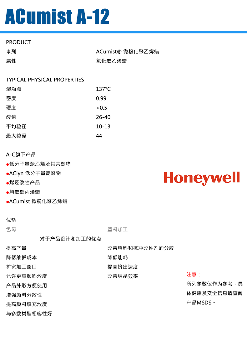 • 霍尼韋爾蠟粉 ACumist A-12 原裝進(jìn)口A12 物性表, 霍尼韋爾蠟粉 ACumist A-12 原裝進(jìn)口A12 產(chǎn)品參數(shù),霍尼韋爾蠟粉 ACumist A-12 原裝進(jìn)口A12 性能表,霍尼韋爾蠟粉 ACumist A-12 原裝進(jìn)口A12 出廠報(bào)告, MSDS,, 物質(zhì)安全資料表, UL黃卡,{ SGS報(bào)告, RoHS, 食品級(jí)認(rèn)證, NSF飲用水標(biāo)準(zhǔn), 產(chǎn)品資料, 產(chǎn)品性能, 出廠報(bào)告, 原廠原包, 代理商, 熱變形溫度, 熔指數(shù), 流動(dòng)系數(shù), 抗沖擊性能、沖擊強(qiáng)度, 低溫韌性、低溫抗沖擊性能, 熔體流動(dòng)系數(shù)、熔體流動(dòng)速率, 加工工藝、加工參數(shù)、加工溫度, 歐盟RoHS 德國FDA 美國FDA 日本FDA