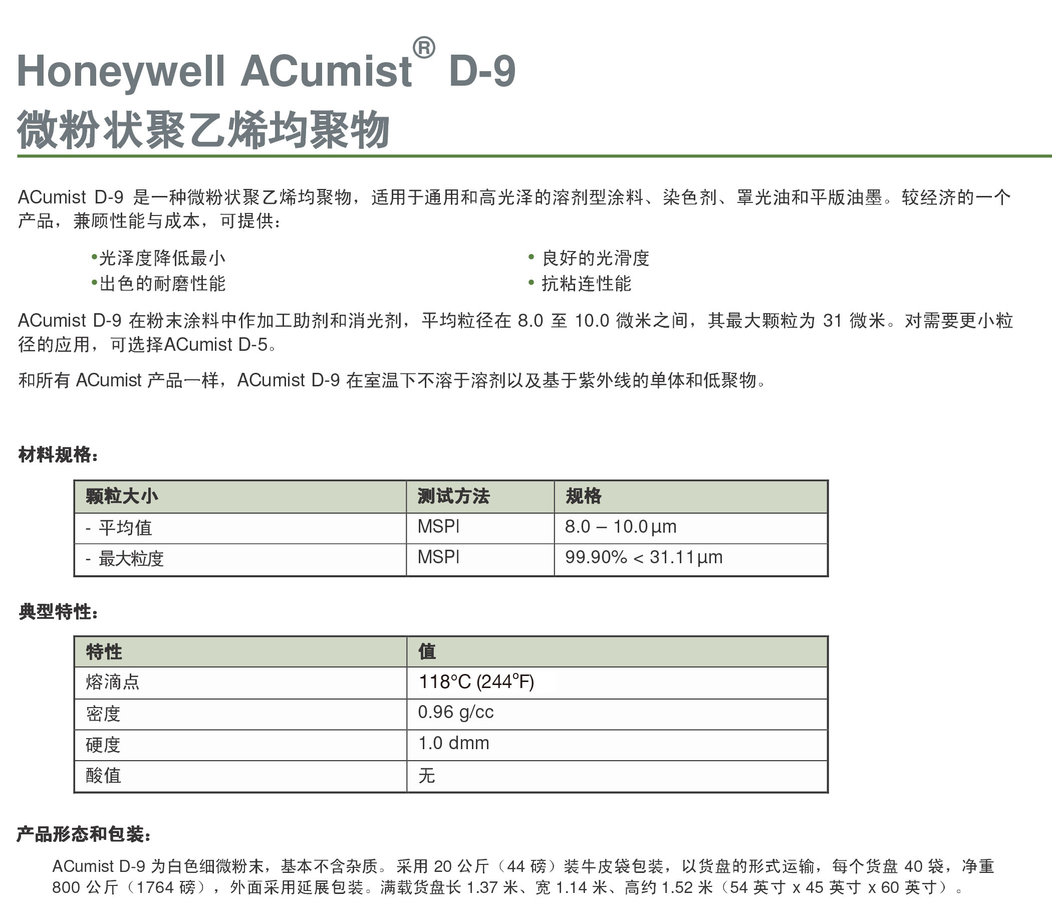 ACumist D-9 是一種微粉狀聚乙烯均聚物,適用于通用和高光澤的溶劑型涂料、染色劑、罩光油和平版油墨。較經(jīng)濟(jì)的一個產(chǎn)品,兼顧性能與成本,可提供:?光澤度降低最小? 良好的光滑度?出色的耐磨性能? 抗粘連性能