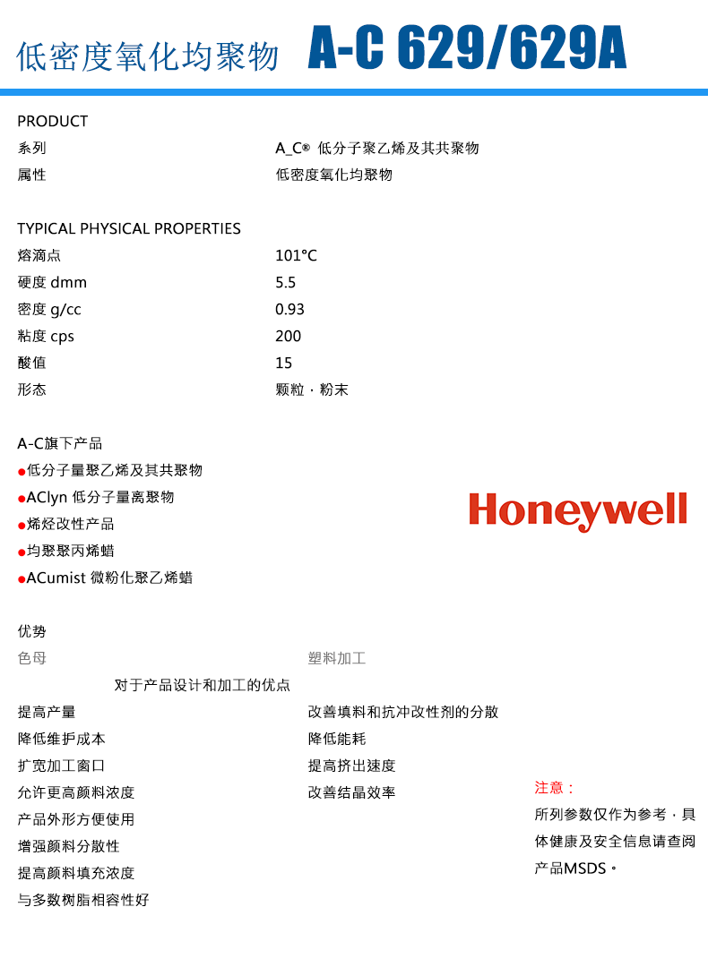 • 美國霍尼韋爾 honeywell 氧化聚乙烯蠟 AC 629 物性表, 美國霍尼韋爾 honeywell 氧化聚乙烯蠟 AC 629 產(chǎn)品參數(shù),美國霍尼韋爾 honeywell 氧化聚乙烯蠟 AC 629 性能表,美國霍尼韋爾 honeywell 氧化聚乙烯蠟 AC 629 出廠報告, MSDS,, 物質(zhì)安全資料表, UL黃卡,{ SGS報告, RoHS, 食品級認證, NSF飲用水標準, 產(chǎn)品資料, 產(chǎn)品性能, 出廠報告, 原廠原包, 代理商, 熱變形溫度, 熔指數(shù), 流動系數(shù), 抗沖擊性能、沖擊強度, 低溫韌性、低溫抗沖擊性能, 熔體流動系數(shù)、熔體流動速率, 加工工藝、加工參數(shù)、加工溫度, 歐盟RoHS 德國FDA 美國FDA 日本FDA