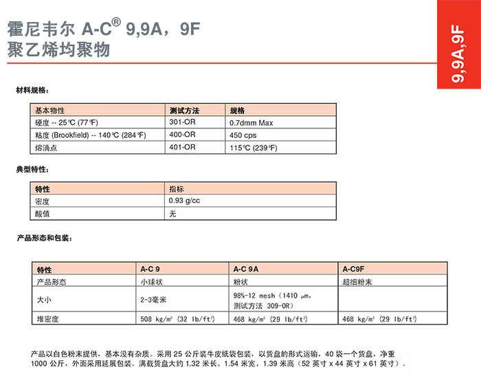• 霍尼韋爾 A-C® 9A 低密度聚乙烯 (LDPE) 均聚物 物性表, 霍尼韋爾 A-C® 9A 低密度聚乙烯 (LDPE) 均聚物 產(chǎn)品參數(shù),霍尼韋爾 A-C® 9A 低密度聚乙烯 (LDPE) 均聚物 性能表,霍尼韋爾 A-C® 9A 低密度聚乙烯 (LDPE) 均聚物 出廠報告, MSDS,, 物質(zhì)安全資料表, UL黃卡,{ SGS報告, RoHS, 食品級認證, NSF飲用水標準, 產(chǎn)品資料, 產(chǎn)品性能, 出廠報告, 原廠原包, 代理商, 熱變形溫度, 熔指數(shù), 流動系數(shù), 抗沖擊性能、沖擊強度, 低溫韌性、低溫抗沖擊性能, 熔體流動系數(shù)、熔體流動速率, 加工工藝、加工參數(shù)、加工溫度, 歐盟RoHS 德國FDA 美國FDA 日本FDA