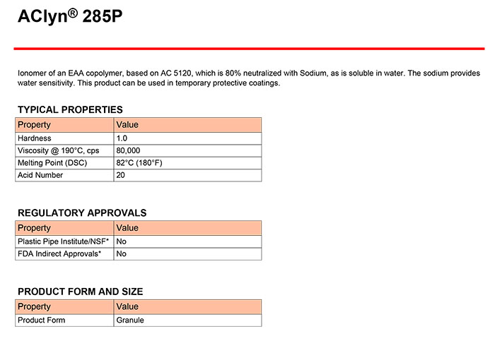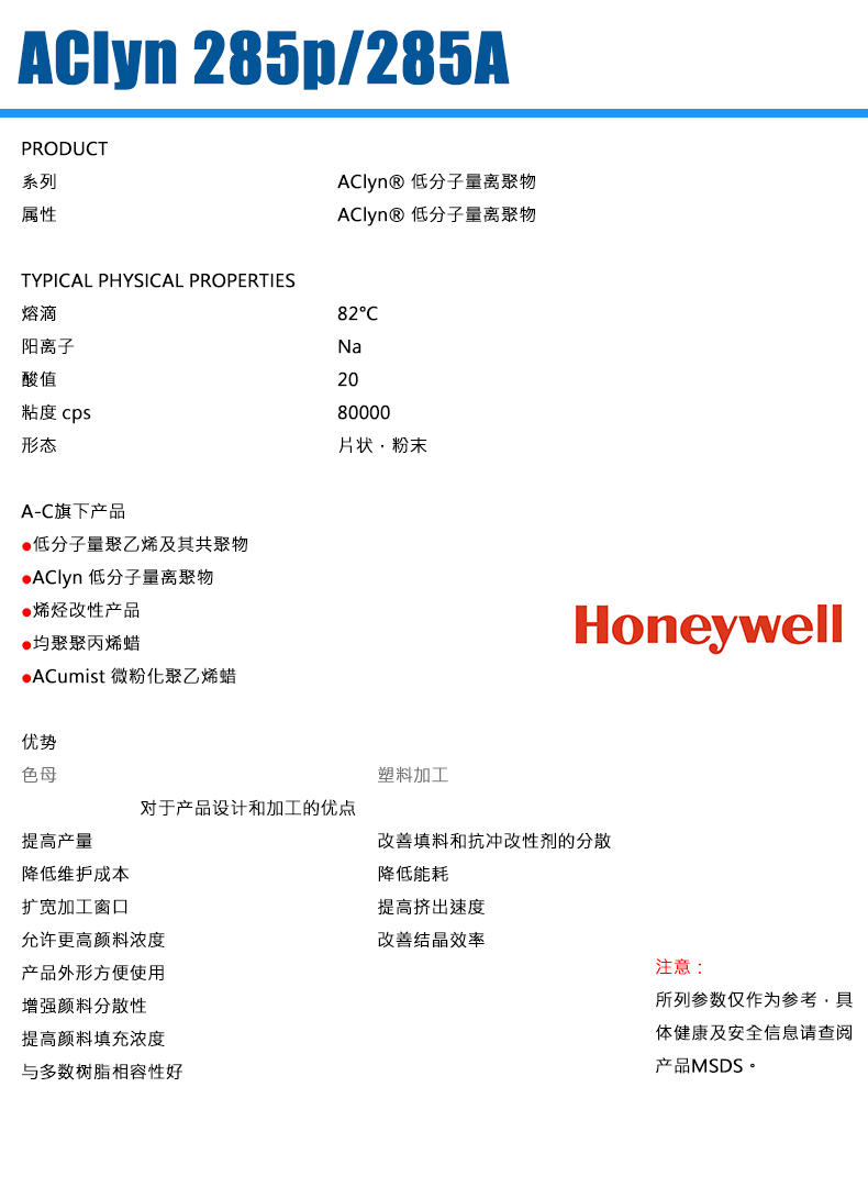- 霍尼韋爾EAA離聚物蠟粉AClyn® 285P 結晶成核劑 物性表, 霍尼韋爾EAA離聚物蠟粉AClyn® 285P 結晶成核劑 產(chǎn)品參數(shù),霍尼韋爾EAA離聚物蠟粉AClyn® 285P 結晶成核劑 性能表,霍尼韋爾EAA離聚物蠟粉AClyn® 285P 結晶成核劑 出廠報告, MSDS,, 物質安全資料表, UL黃卡,{ SGS報告, RoHS, 食品級認證, NSF飲用水標準, 產(chǎn)品資料, 產(chǎn)品性能, 出廠報告, 原廠原包, 代理商, 熱變形溫度, 熔指數(shù), 流動系數(shù), 抗沖擊性能、沖擊強度, 低溫韌性、低溫抗沖擊性能, 熔體流動系數(shù)、熔體流動速率, 加工工藝、加工參數(shù)、加工溫度, 歐盟RoHS 德國FDA 美國FDA 日本FDA