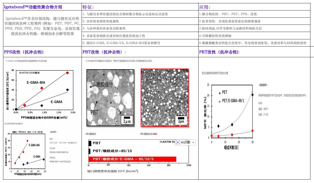 用途:作為反應(yīng)型改性劑,添加2-10%有效地提高PBT/PPS/PET等工程塑料以及合金的抗沖擊強(qiáng)度以及熱疲勞性能。此外,還可以用來(lái)熱粘結(jié)各種塑料和金屬等材料的用途。