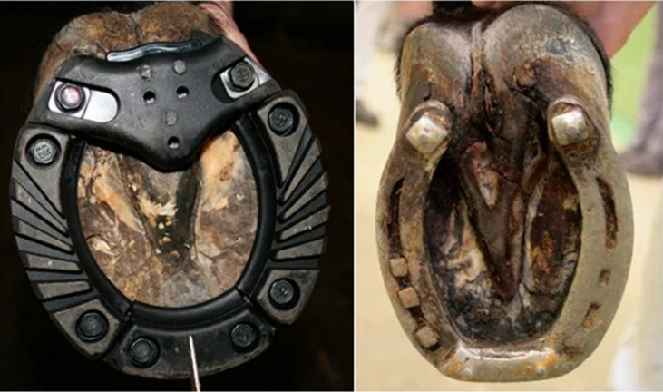 聚氨酯鞋被鋼制鞋釘釘在蹄上,另一面被擰到馬蹄鐵上。