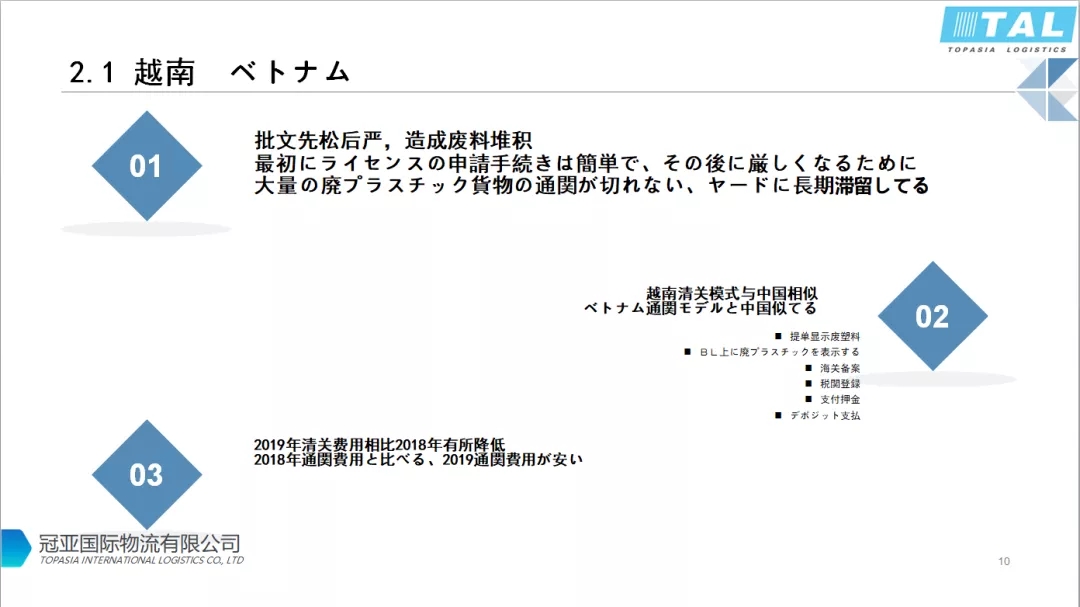 有批文的還是可以正常清關(guān),通關(guān)時間也很迅速。越南廢料的清關(guān)模式跟之前中國很像,提單必須顯示廢塑料,收貨人需要在海關(guān)備案,進口報關(guān)的時間需要支付押金?,F(xiàn)在問題是只有少數(shù)幾家船公司愿意接去越南的貨。相比2018年的情況,2019年下半年陸續(xù)出來很多新的批文,清關(guān)費用也在逐步降低。