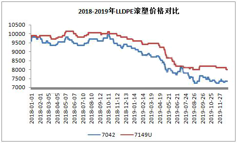 從圖中顯示,2018-2019年國內(nèi)滾塑料價格明顯高于普通線性,且價格差距逐步擴大,2019年較普通線性高50-850元/噸。目前國內(nèi)聚烯烴行業(yè)產(chǎn)能過剩,國內(nèi)石化一直致力于高端產(chǎn)品研發(fā),搶占高端領(lǐng)域,以獲取較大利潤。從線性區(qū)域來看,由于產(chǎn)能過剩,7042價格近兩年一直處于下行通道,削減了石化利潤。線性行業(yè),近年來,研發(fā)主要方向集中在C8線性,茂金屬、滾塑料等,其中滾塑料做為一個分支,近年研發(fā)較多。