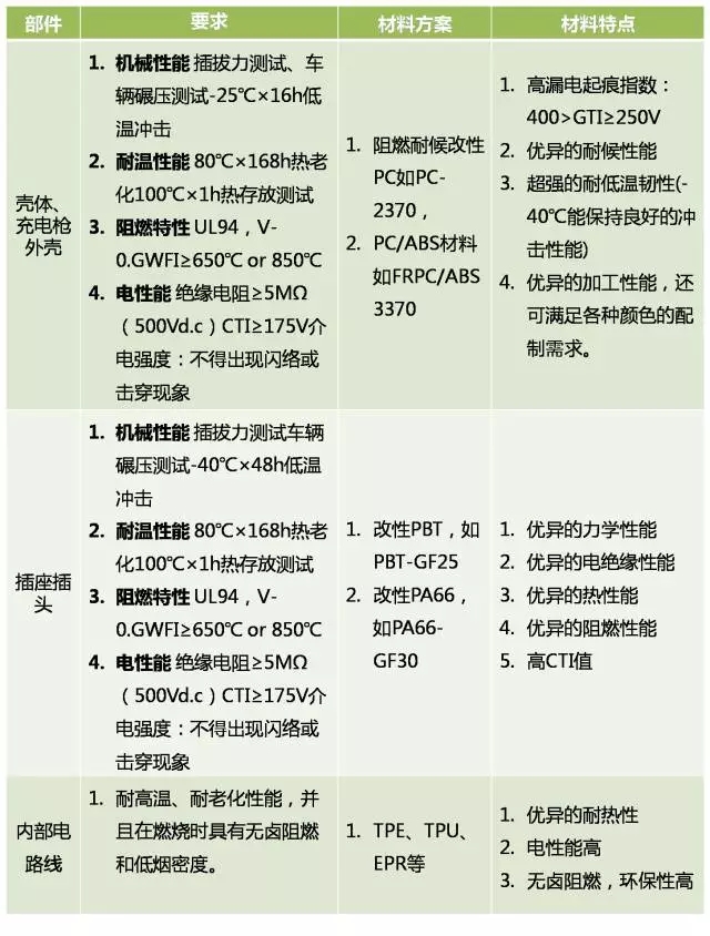 ????????充電設施的標準目前也尚不完全一致。由于不同電動汽車的電壓平臺不同,再加上接口、通訊協(xié)議等技術因素的不同,這直接導致了樁與樁之間不能互聯(lián)互通,而且車樁不匹配的問題非常突出。充電設施包括充電樁、高壓線、高壓接插件和充電槍等高壓部件。其重要性與車內的動力電池一樣,都需要考慮充電的阻燃性、安全性等方面。根據目前國內發(fā)布的充電設施的標準和要求,我們對充電樁和充電槍外殼、插座插頭以及內部的高壓線束的阻燃材料進行了整理,并列舉了目前充電設施的產品,對相應的材料性能特點進行分析。