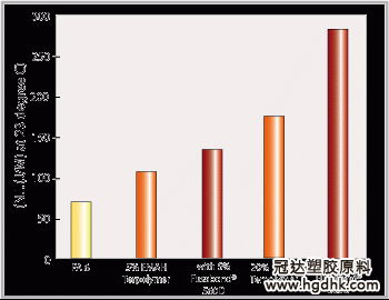 從表3.1中可以看出,增塑的聚氯乙烯和純的熱塑性聚氨酯硬度分歧不大,由于,隨TPU塑膠量的增長(zhǎng)的分歧配比,硬度轉(zhuǎn)變也不太大;在TPU為分別相時(shí),對(duì)應(yīng)的TPU/PVC共混物拉伸強(qiáng)度都要高于純的TPU;隨TPU量增長(zhǎng),TPU逐步改釀成延續(xù)相時(shí),共混物拉伸強(qiáng)度有降落的趨向,只是在TPU作為延續(xù)相而且大批、由于Fusabond? 560D存在出格為尼龍6設(shè)計(jì)的化學(xué)結(jié)構(gòu),它在前進(jìn)尼龍6抗沖性能的同時(shí),也能前進(jìn)其在模具內(nèi)的加工性能。與現(xiàn)有核心體增韌劑對(duì)照,盤(pán)曲模量喪失小,概況光潔度好,本錢(qián)低廉,且可在室溫到-20 ℃條件下連結(jié)彈性等其他功效。