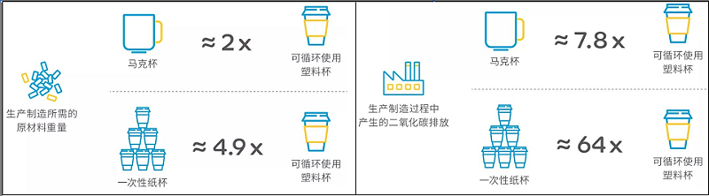 研究數(shù)據(jù)顯示:以一個普通大小的杯子為例,可循環(huán)使用的塑料杯對比馬克杯和一次性紙杯,無論在生產(chǎn)過程中的原材料損耗還是二氧化碳排放都占據(jù)優(yōu)勢。