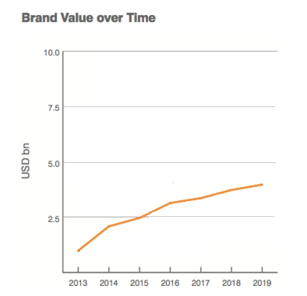 Brand Finance 品牌估值方法采用“特許費節(jié)省法”(Royalty Relief):即在假設(shè)品牌所用者不再擁有該品牌的前提下,品牌所有者必須支付的使用該品牌的費用。排行榜中的品牌價值數(shù)字是品牌作為資產(chǎn)轉(zhuǎn)讓的潛在價值。一家公司可能擁有多個品牌,企業(yè)價值是其所有各品牌相關(guān)資產(chǎn)和收入流價值的總和。