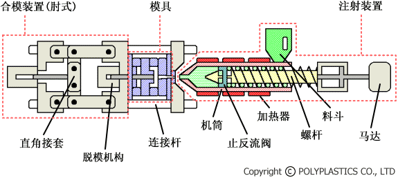 注塑成型機(jī)器可以分為兩種裝置:分別為合模裝置與注射裝置。