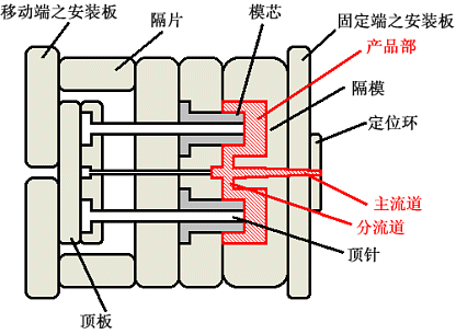 成型品是由熔融樹脂進(jìn)入的主流道,引導(dǎo)熔融樹脂進(jìn)入模腔的分流道及制品所構(gòu)成的。