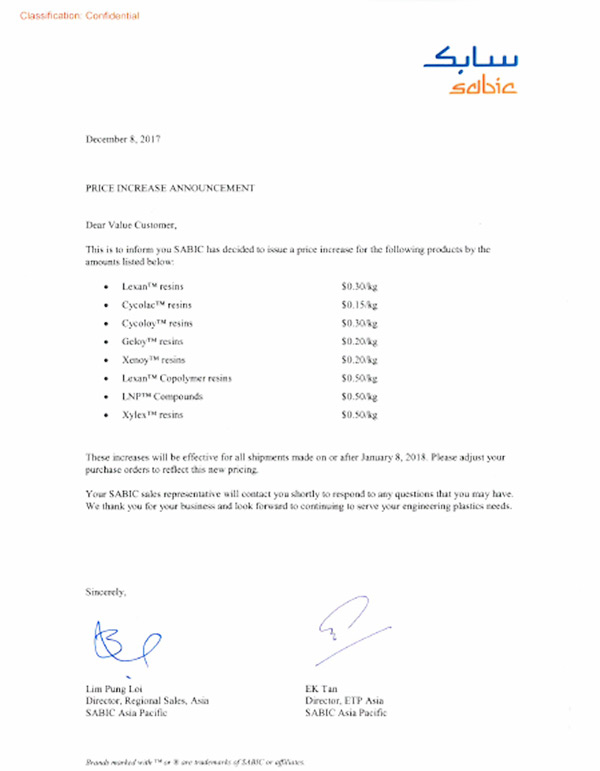 鉅衍塑化小編通知大家,SABIC官方漲價函如圖所示: