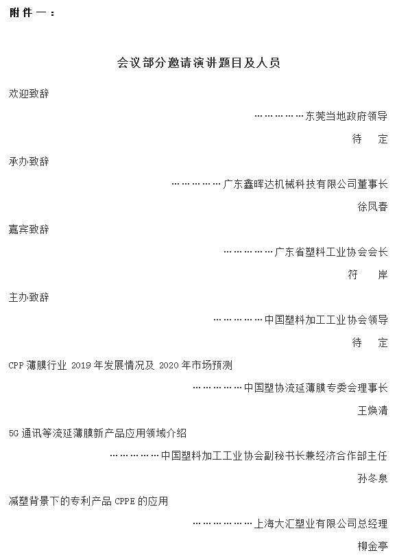 ????????為了交流行業(yè)信息,推廣新技術(shù)、新設(shè)備、新材料,鼓勵(lì)技術(shù)創(chuàng)新,促進(jìn)行業(yè)發(fā)展,中國塑協(xié)流延薄膜專業(yè)委員會(huì)(簡稱流延薄膜專委會(huì))將于2019年12月26日-27日在廣東東莞召開“2019流延薄膜行業(yè)市場(chǎng)與技術(shù)發(fā)展高峰論壇暨流延薄膜專委會(huì)換屆大會(huì)、流延聚乙烯纏繞膜、牧草膜行業(yè)誠信與創(chuàng)新發(fā)展聯(lián)盟成立大會(huì)暨《流延聚乙烯纏繞膜》團(tuán)體標(biāo)準(zhǔn)第一次工作會(huì)議”。