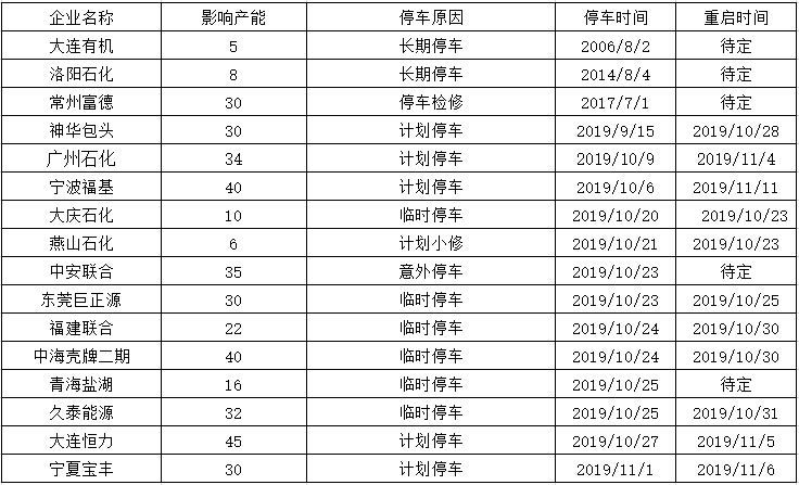 ????????10月份國內(nèi)聚丙烯檢修裝置較上月明顯減少。本月檢修損失量21萬噸。月內(nèi)裝置臨時(shí)停車較多,久泰能源、燕山石化、大慶石化、中安聯(lián)合、東莞巨正源、福建聯(lián)合二線、中海殼、久泰能源等裝置短期停車,多數(shù)已經(jīng)重啟。前期計(jì)劃檢修裝置延安煉廠、陜西延安能源、神華包頭、寧波臺(tái)塑等裝置月內(nèi)已重啟。目前廣州石化一、三線、東華能源(寧波)裝置處于停車狀態(tài),預(yù)計(jì)11月初重啟。后期寧夏寶豐存檢修計(jì)劃,整體供應(yīng)壓力較大。
