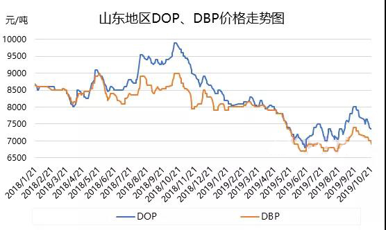 ????????如上圖所示,國內(nèi)DOP、DBP價格亦是不斷下行。就DOP而言,行業(yè)供應充足,去庫存阻力重重,為減緩出貨阻力,市場低價不斷增加,疊加原料辛醇及苯酐跌勢,偏空情緒維持,愈跌愈不買跌始終貫穿。但跌至目前價位:山東7300-7500元/噸自提,江蘇7500元/噸自提,華南7800-7900元/噸送到,加之辛醇尚未有新低價出現(xiàn),帶動一定維價,今日走勢呈現(xiàn)平穩(wěn),雖然接近心理價位,但缺乏實質(zhì)利好基礎上,仍多謹慎。就DBP而言,行業(yè)整體開工負荷不高,庫存壓力不大,且原料丁醇及萘系苯酐,一走勢基本平穩(wěn),一走勢破位下行,導致市場雖然下行,但波動基本窄幅度。