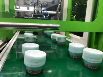 ????????伊之密PacPro薄壁包裝產(chǎn)品成型方案在現(xiàn)場也進行了展示,2.2秒內(nèi)高速成型一出四貼標圓形容器。