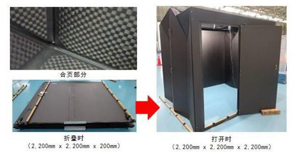 ????????該試制品是在CFRP(碳纖維復(fù)合材料)制的面板上貼合GFRP(玻璃纖維復(fù)合材料)合頁制成的約11m3的簡易型小房間,約40kg,因其十分輕量,無需使用大型機械和工具,兩個成人即可簡單搭建。