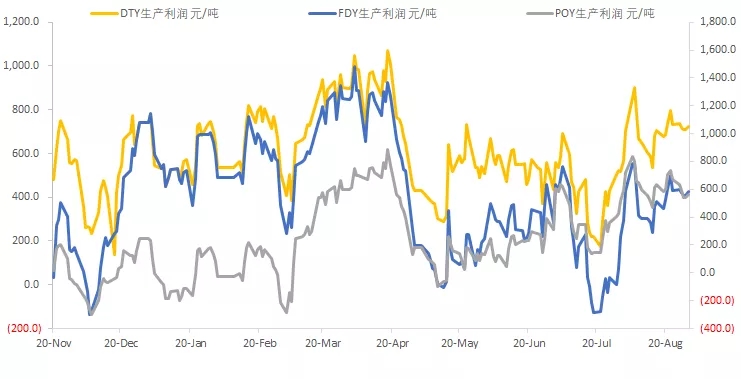 ????????最近聚酯產(chǎn)業(yè)鏈下游利潤(rùn)和開(kāi)工率齊升,說(shuō)明終端對(duì)聚酯的需求還不錯(cuò),上游讓渡的利潤(rùn)也盤(pán)活了下游企業(yè)。長(zhǎng)絲的產(chǎn)銷最近也有所回升,8月份平均產(chǎn)銷率為83%,基本上與去年同期持平,反觀7月份的平均產(chǎn)銷率只有55%,8月份下游真的是有很大起色,但是上游PTA毫無(wú)起色。