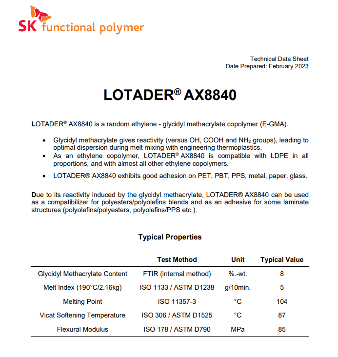 - EMA 法國(guó)阿科瑪 韓國(guó)SK Lotader AX 8840 粘接性好 無(wú)規(guī)共聚物 可分散 塑料改性 粘合劑塑料增韌抗沖擊改性劑 物性表, EMA 法國(guó)阿科瑪 韓國(guó)SK Lotader AX 8840 粘接性好 無(wú)規(guī)共聚物 可分散 塑料改性 粘合劑塑料增韌抗沖擊改性劑 產(chǎn)品參數(shù),EMA 法國(guó)阿科瑪 韓國(guó)SK Lotader AX 8840 粘接性好 無(wú)規(guī)共聚物 可分散 塑料改性 粘合劑塑料增韌抗沖擊改性劑 性能表,EMA 法國(guó)阿科瑪 韓國(guó)SK Lotader AX 8840 粘接性好 無(wú)規(guī)共聚物 可分散 塑料改性 粘合劑塑料增韌抗沖擊改性劑 出廠報(bào)告, MSDS,, 物質(zhì)安全資料表, UL黃卡,{ SGS報(bào)告, RoHS, 食品級(jí)認(rèn)證, NSF飲用水標(biāo)準(zhǔn), 產(chǎn)品資料, 產(chǎn)品性能, 出廠報(bào)告, 原廠原包, 代理商, 熱變形溫度, 熔指數(shù), 流動(dòng)系數(shù), 抗沖擊性能、沖擊強(qiáng)度, 低溫韌性、低溫抗沖擊性能, 熔體流動(dòng)系數(shù)、熔體流動(dòng)速率, 加工工藝、加工參數(shù)、加工溫度, 歐盟RoHS 德國(guó)FDA 美國(guó)FDA 日本FDA