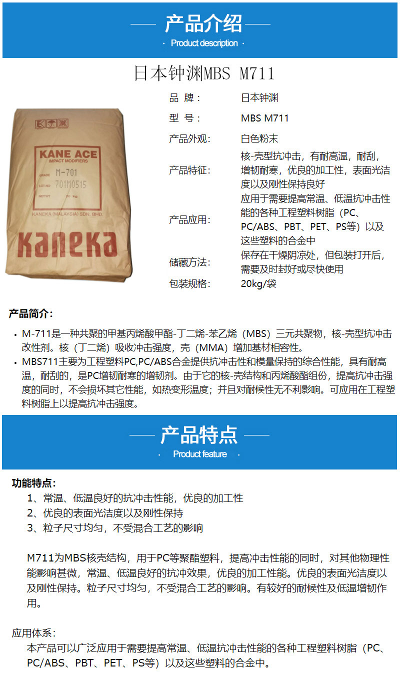 - MBS日本鐘淵M711 耐寒耐候增韌劑 PC抗沖擊改性劑 鐘淵mbs711 物性表, MBS日本鐘淵M711 耐寒耐候增韌劑 PC抗沖擊改性劑 鐘淵mbs711 產(chǎn)品參數(shù),MBS日本鐘淵M711 耐寒耐候增韌劑 PC抗沖擊改性劑 鐘淵mbs711 性能表,MBS日本鐘淵M711 耐寒耐候增韌劑 PC抗沖擊改性劑 鐘淵mbs711 出廠報告, MSDS,, 物質(zhì)安全資料表, UL黃卡,{ SGS報告, RoHS, 食品級認(rèn)證, NSF飲用水標(biāo)準(zhǔn), 產(chǎn)品資料, 產(chǎn)品性能, 出廠報告, 原廠原包, 代理商, 熱變形溫度, 熔指數(shù), 流動系數(shù), 抗沖擊性能、沖擊強(qiáng)度, 低溫韌性、低溫抗沖擊性能, 熔體流動系數(shù)、熔體流動速率, 加工工藝、加工參數(shù)、加工溫度, 歐盟RoHS 德國FDA 美國FDA 日本FDA