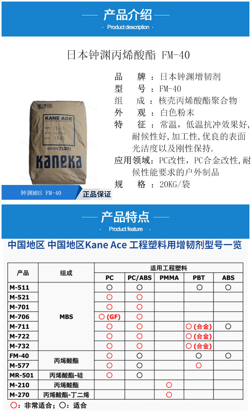 - 日本鐘淵FM40 PC低溫常溫改性PBT抗沖擊劑 丙烯酸酯類增韌劑FM-40 物性表, 日本鐘淵FM40 PC低溫常溫改性PBT抗沖擊劑 丙烯酸酯類增韌劑FM-40 產(chǎn)品參數(shù),日本鐘淵FM40 PC低溫常溫改性PBT抗沖擊劑 丙烯酸酯類增韌劑FM-40 性能表,日本鐘淵FM40 PC低溫常溫改性PBT抗沖擊劑 丙烯酸酯類增韌劑FM-40 出廠報告, MSDS,, 物質(zhì)安全資料表, UL黃卡,{ SGS報告, RoHS, 食品級認(rèn)證, NSF飲用水標(biāo)準(zhǔn), 產(chǎn)品資料, 產(chǎn)品性能, 出廠報告, 原廠原包, 代理商, 熱變形溫度, 熔指數(shù), 流動系數(shù), 抗沖擊性能、沖擊強(qiáng)度, 低溫韌性、低溫抗沖擊性能, 熔體流動系數(shù)、熔體流動速率, 加工工藝、加工參數(shù)、加工溫度, 歐盟RoHS 德國FDA 美國FDA 日本FDA