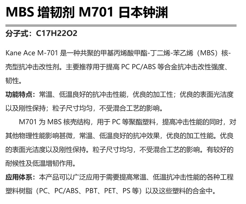 - 日本鐘淵MBS M701增韌劑 PC/ABS合金抗沖擊劑 增韌改性鐘淵mbs701 物性表, 日本鐘淵MBS M701增韌劑 PC/ABS合金抗沖擊劑 增韌改性鐘淵mbs701 產(chǎn)品參數(shù),日本鐘淵MBS M701增韌劑 PC/ABS合金抗沖擊劑 增韌改性鐘淵mbs701 性能表,日本鐘淵MBS M701增韌劑 PC/ABS合金抗沖擊劑 增韌改性鐘淵mbs701 出廠報(bào)告, MSDS,, 物質(zhì)安全資料表, UL黃卡,{ SGS報(bào)告, RoHS, 食品級(jí)認(rèn)證, NSF飲用水標(biāo)準(zhǔn), 產(chǎn)品資料, 產(chǎn)品性能, 出廠報(bào)告, 原廠原包, 代理商, 熱變形溫度, 熔指數(shù), 流動(dòng)系數(shù), 抗沖擊性能、沖擊強(qiáng)度, 低溫韌性、低溫抗沖擊性能, 熔體流動(dòng)系數(shù)、熔體流動(dòng)速率, 加工工藝、加工參數(shù)、加工溫度, 歐盟RoHS 德國(guó)FDA 美國(guó)FDA 日本FDA