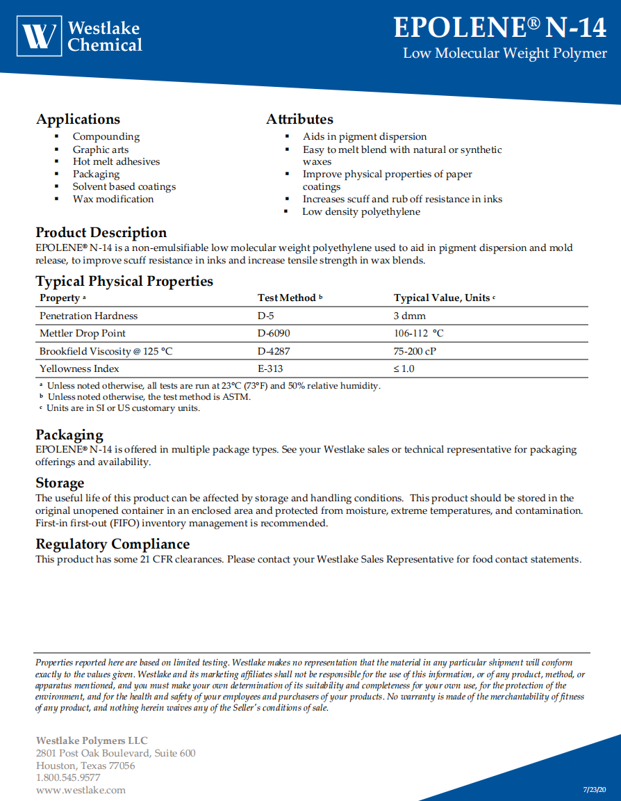 • 美國西湖化學WESTLAKEN14 聚乙烯蠟 N-14 物性表, 美國西湖化學WESTLAKEN14 聚乙烯蠟 N-14 產品參數(shù),美國西湖化學WESTLAKEN14 聚乙烯蠟 N-14 性能表,美國西湖化學WESTLAKEN14 聚乙烯蠟 N-14 出廠報告, MSDS,, 物質安全資料表, UL黃卡,{ SGS報告, RoHS, 食品級認證, NSF飲用水標準, 產品資料, 產品性能, 出廠報告, 原廠原包, 代理商, 熱變形溫度, 熔指數(shù), 流動系數(shù), 抗沖擊性能、沖擊強度, 低溫韌性、低溫抗沖擊性能, 熔體流動系數(shù)、熔體流動速率, 加工工藝、加工參數(shù)、加工溫度, 歐盟RoHS 德國FDA 美國FDA 日本FDA