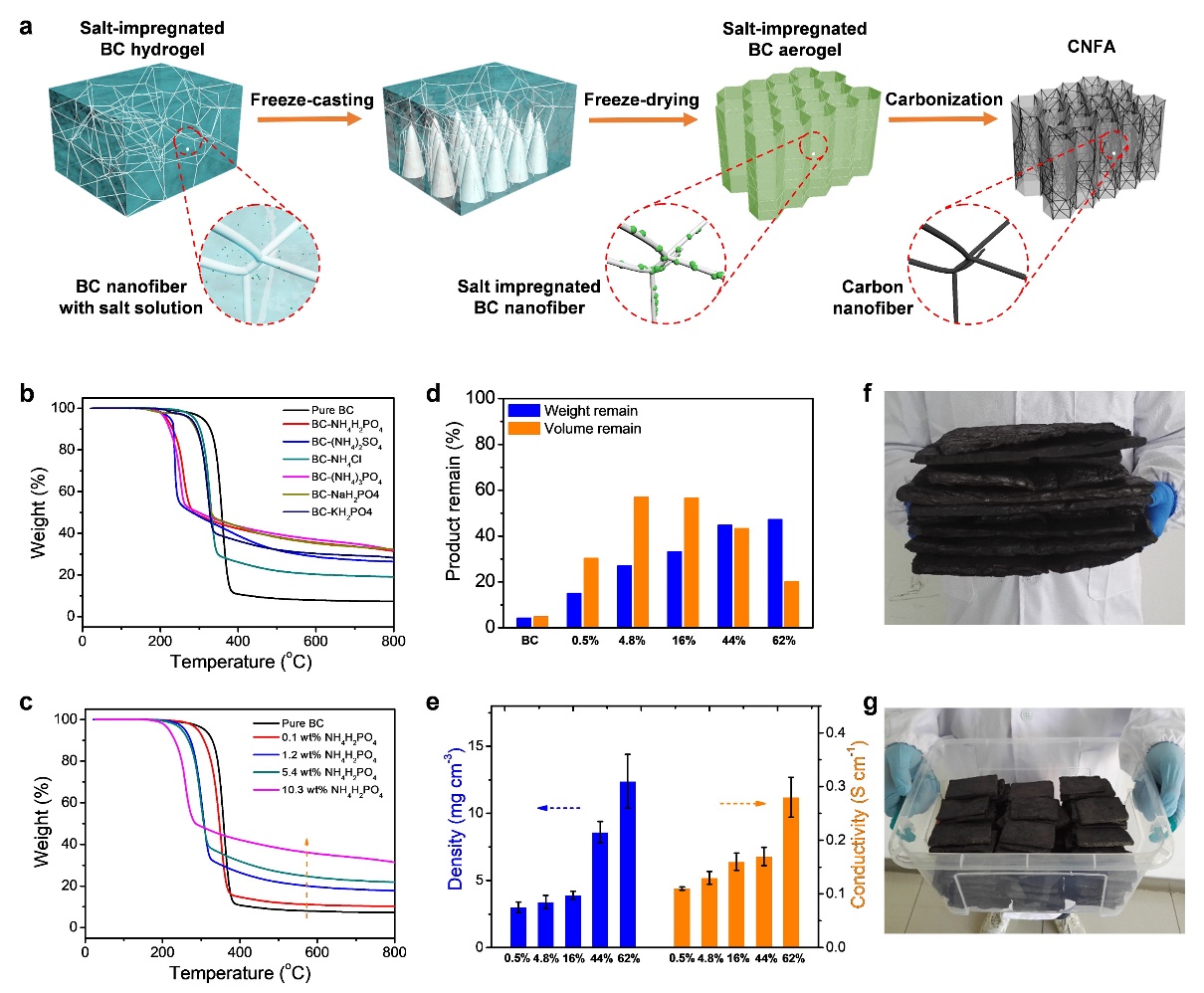 圖1、宏觀尺寸CNFAs的合成。(a)CNFAs制造工藝示意圖;(b)純BC和BC浸漬NH4H2PO4、(NH4)2SO4、NH4Cl、(NH4)3PO4、NaH2PO4或KH2PO4的TG曲線;(c)純BC和BC浸漬不同濃度NH4H2PO4后的TG曲線;(d)以純BC和BC為原料,在800°C下加入不同量的NH4H2PO4炭化制備CNFAs(NH4H2PO4的重量比分別為0.5、4.8、16、44和62 wt%);(e)1200 ℃下制備的CNFAs的密度和導電性;(f ~g)在800℃下制備的CNFAs照片,展示了其可以大規(guī)模制備。