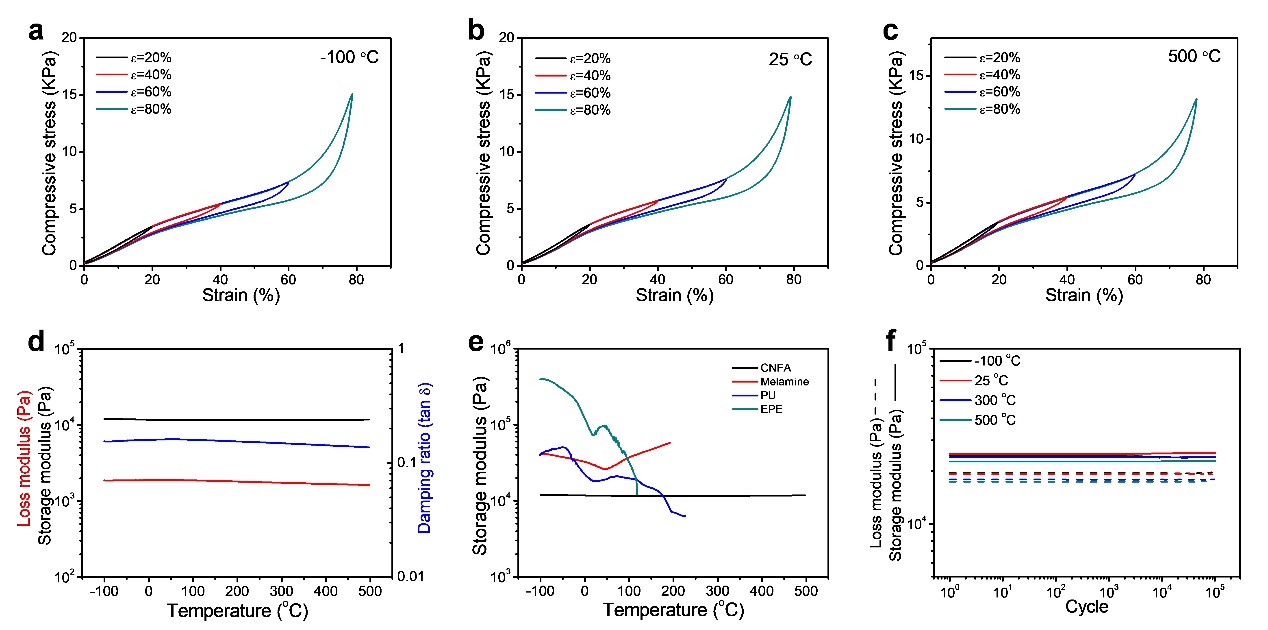 圖2、CNFAs在T = -100~500℃時N2中的熱力學穩(wěn)定的力學性能。(a~c)形變?yōu)?0%、40%、60%和80%時CNFAs的壓縮應力-應變曲線,溫度分別為:a)-100 °C、b)25 °C和c)500 °C;(d)CNFAs在T = -100-500℃時的粘彈性(儲存模量、損耗模量和阻尼比);(e)CNFA、三聚氰胺、PU和EPE泡沫的儲存模量隨溫度的變化;(f)不同溫度下CNFAs在1×105次循環(huán)中的儲存模量和損耗模量。