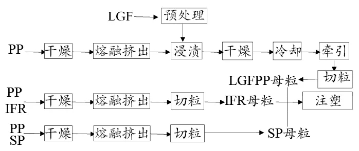 ????????將PP,ODOPE,Sb2O3,EG按一定的比例加入到高速混合機中,均勻混合后加入到雙螺桿擠出機中(溫度250℃,螺桿轉(zhuǎn)速300r/min),經(jīng)過熔融共混,熔體進入LGF浸漬模具(溫度設(shè)定260℃),LGF經(jīng)過分散、充分浸漬,經(jīng)口模牽引拉出、水冷、風干、造粒,得到阻燃LGFPP顆粒, 然后注塑成試樣。