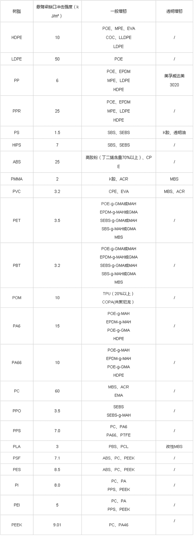 史上最全各類塑料的沖擊性能及常用增韌劑
